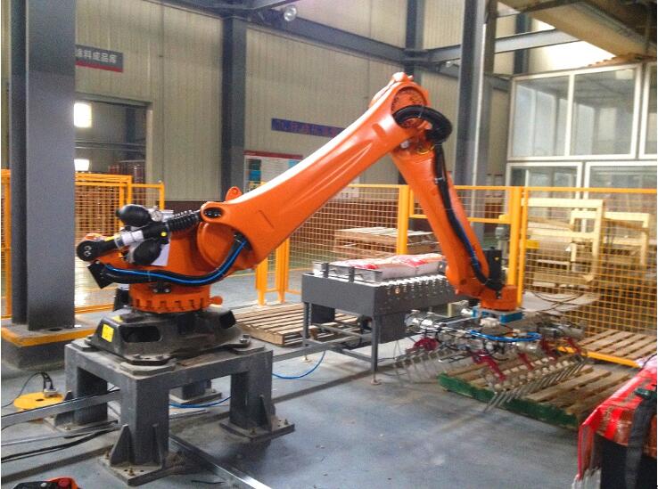 将产品通过进料输送带输送进料,机器人及夹具到产品上方,抓取产品后移动到栈板位,按事先输入的麻豆操逼电影形式进行产品码放。