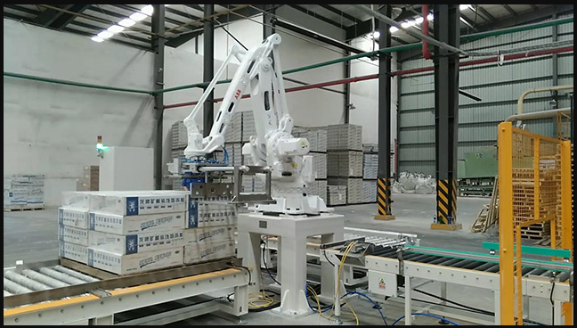 将产品通过进料输送带输送进料,机器人及夹具到产品上方,抓取产品后移动到栈板位,按事先输入的麻豆操逼电影形式进行产品码放。